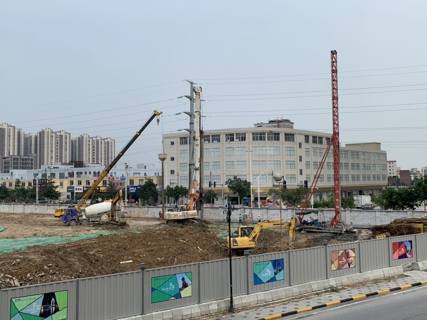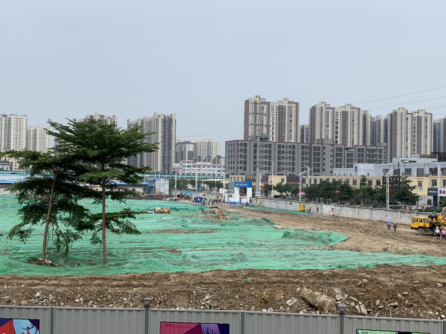 C地块工程开工已完成部分场地的平整,铺设防尘网,材料进场准备就绪,大型机械陆续进场,部分位置灌孔桩正在加班加点的进行施工。